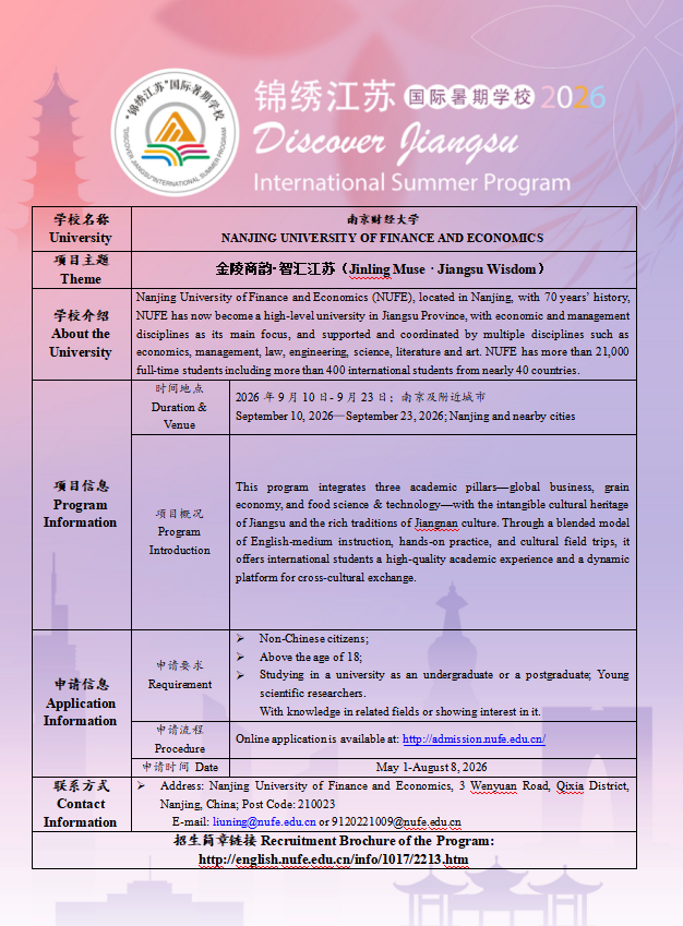 2026“锦绣江苏”国际暑期学校(2026 "Discover Jiangsu" International Summer School)